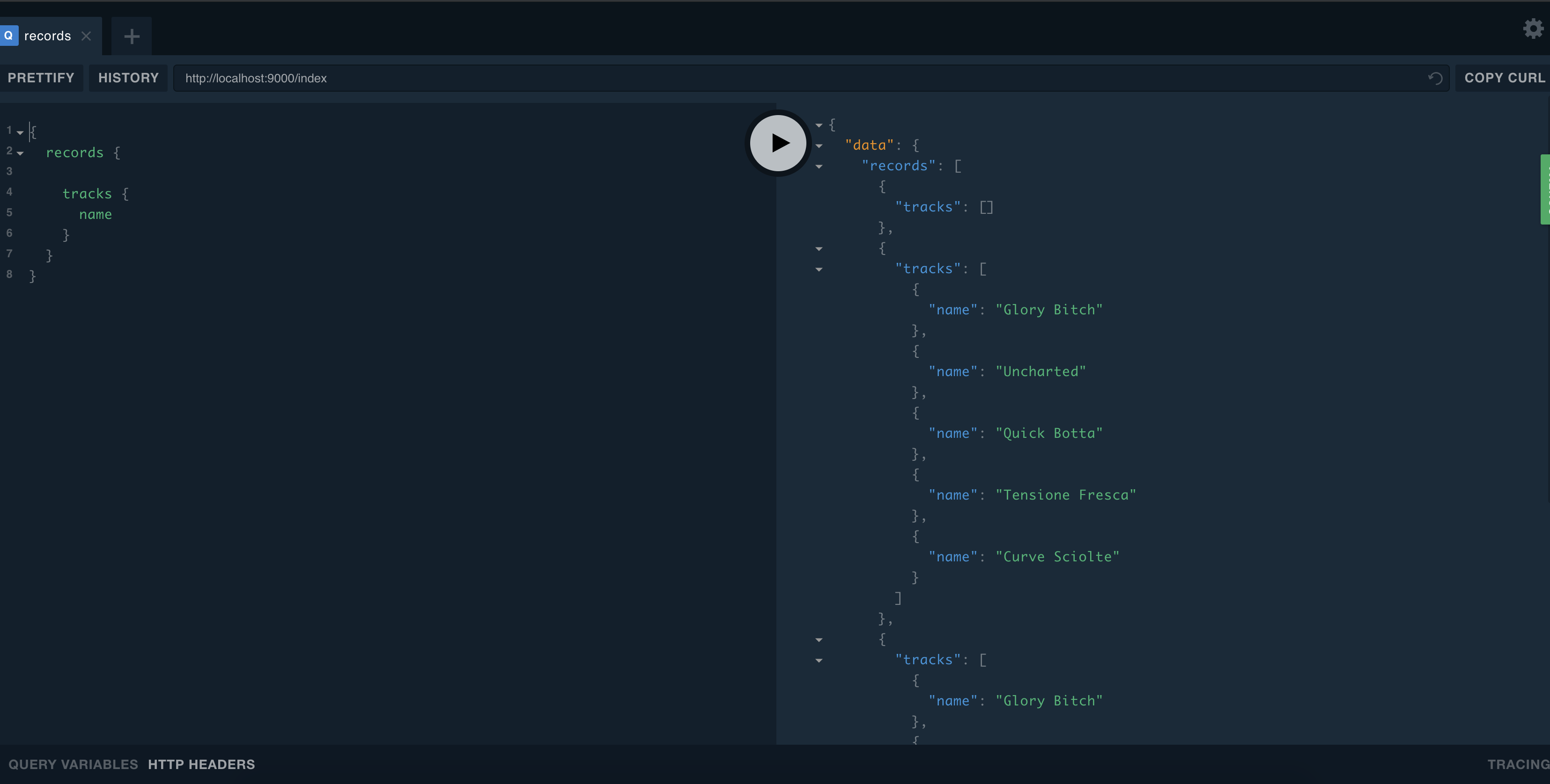 This should start the dev server on port 9000. If you go to http://localhost:9000/index in a web browser, it will launch the GraphQL playground. This is a graphical interface to explore the API and experience the beautiful introspection that comes with the spec. Give it a try yourself.